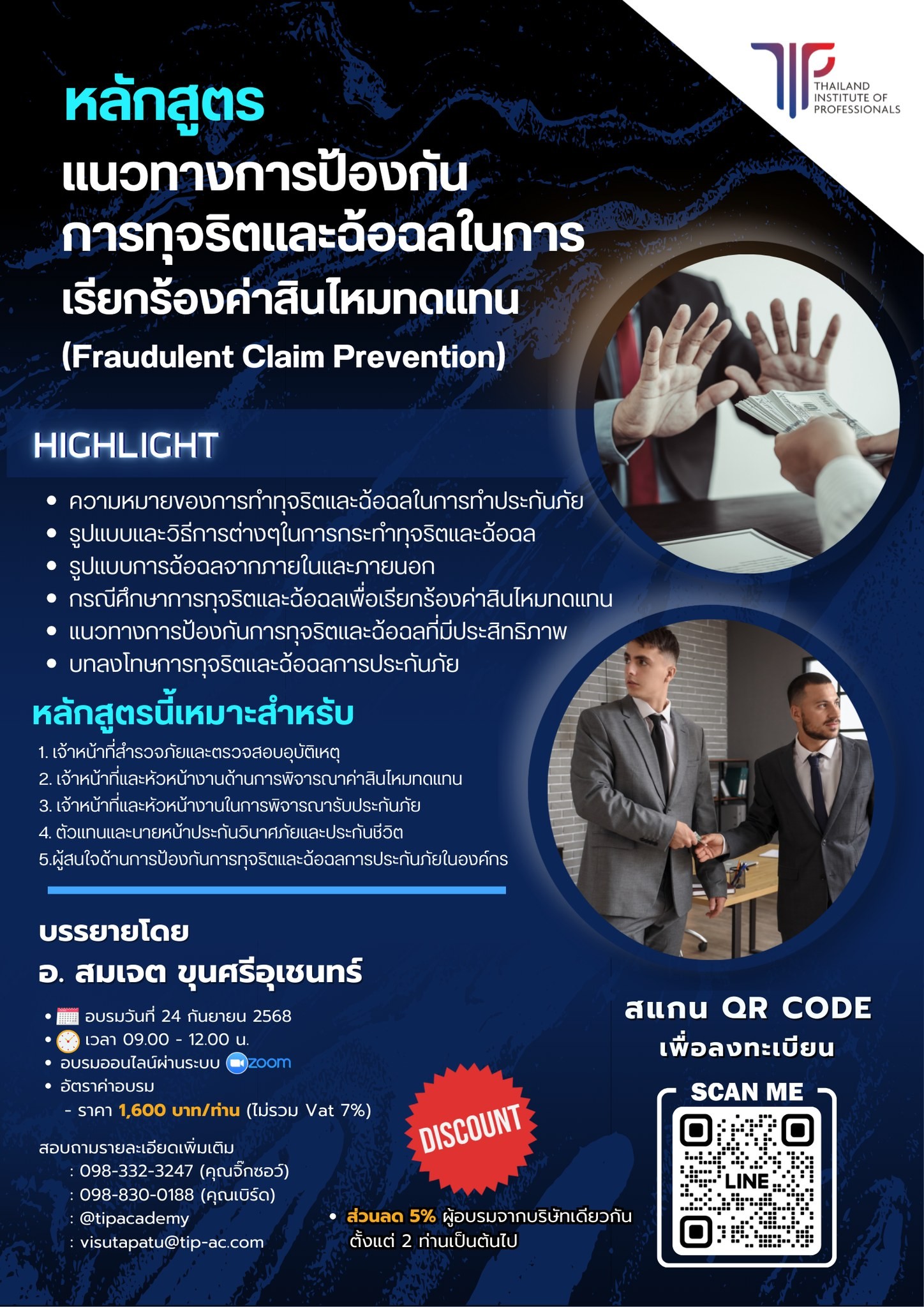📝 หลักสูตร แนวทางการป้องกันการทุจริตและฉ้อฉลในการเรียกร้องค่าสินไหมทดแทน