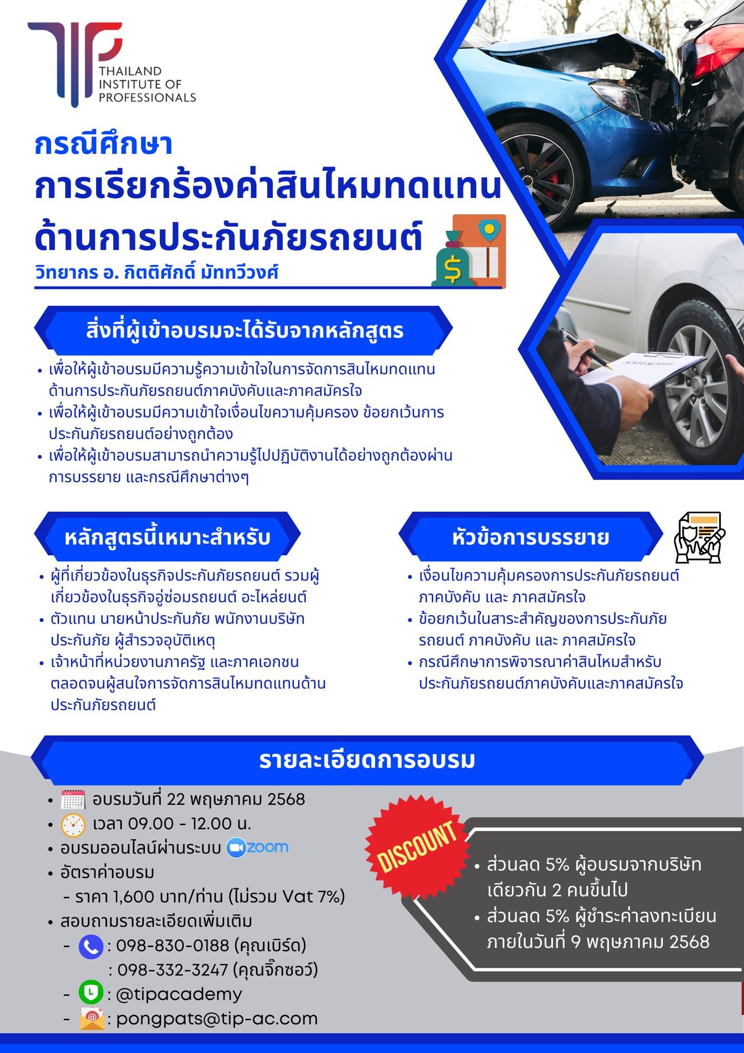 📝 หลักสูตร กรณีศึกษาการเรียกร้องค่าสินไหมทดแทนด้านการประกันภัยรถยนต์